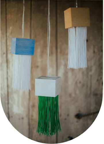 Fully hand-made lamp by skilled craftsmen. The structure is made of solid wood, decorated later with natural pigments. It is complemented by pvc filaments and led spotlights. All of this can be customized by changing the filament color.