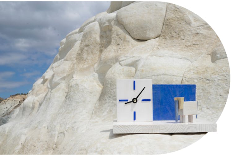 Orologio da tavolo realizzato in legno massello. E' decorato interamente a mano con terre naturali. E' un orologio che, grazie alla sua essenzialità nella forma, riesce ad adattarsi a qualsiasi arredo della casa.