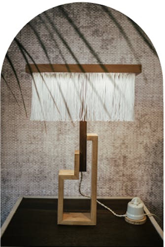 Lampada da tavolo realizzata a mano in legno massello di noce nazionale. E' completata da filamenti in pvc, plexiglass e da interruttore in ceramica vintage. L'illuminazione è a led.