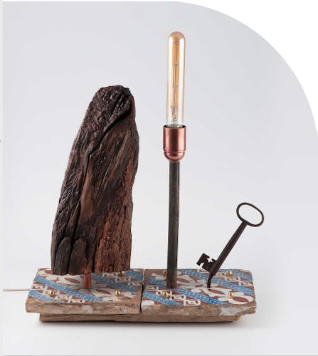 Lampada interamente realizzata a mano la cui base è composta da antiche maioliche siciliane, legno secolare di ulivo e una chiave in ferro battuto di un antico portone.