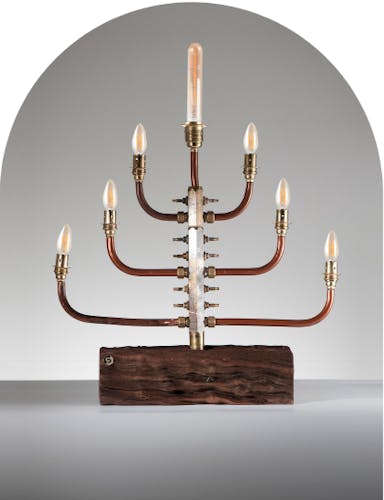 Informazioni: Lampada Interamente realizzata a mano con bacchette orizzontali e verticali in rame, collettore idrico posizionato al centro in ottone, il tutto unicamente riciclato, legno secolare scavato e modellato dal tempo.